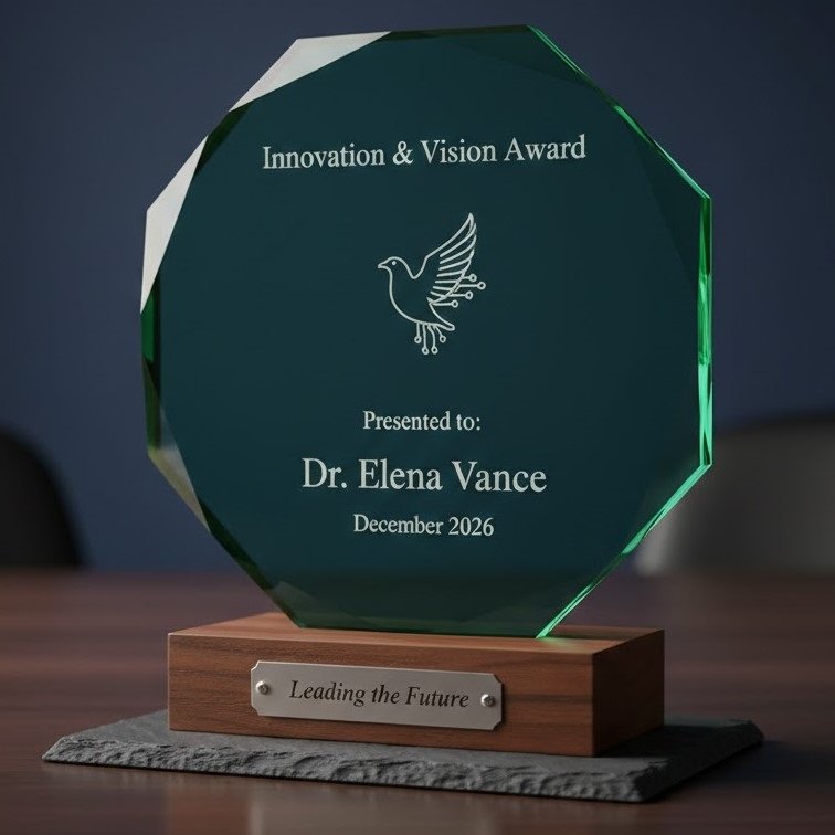 Celebrate a lifetime of commitment with our Custom Dedication Award. This prestigious honor is meticulously handcrafted from layers of sustainable bamboo and recycled optical glass, creating a profound sense of depth and permanence. Perfect for long-term service or community milestones, its organic textures and clean lines offer a timeless aesthetic. By choosing this award, you provide a heartfelt tribute to tireless effort while supporting a business model that prioritizes the health of our planet.