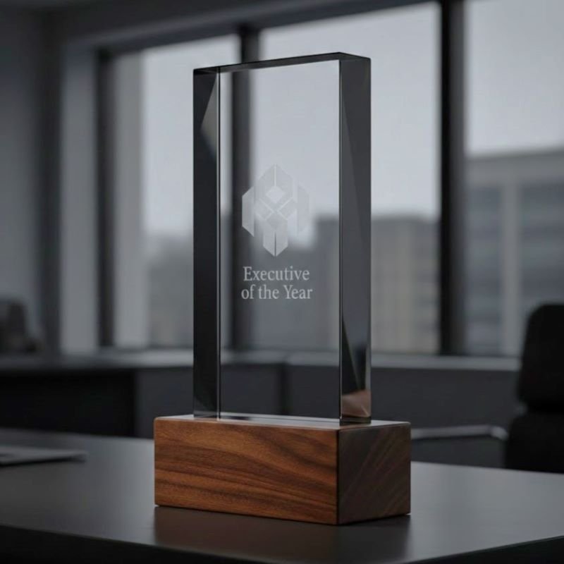 A high-prestige executive trophy featuring a substantial recycled glass plaque and a reclaimed wood base, personalized with elegant, eco-friendly laser etching.