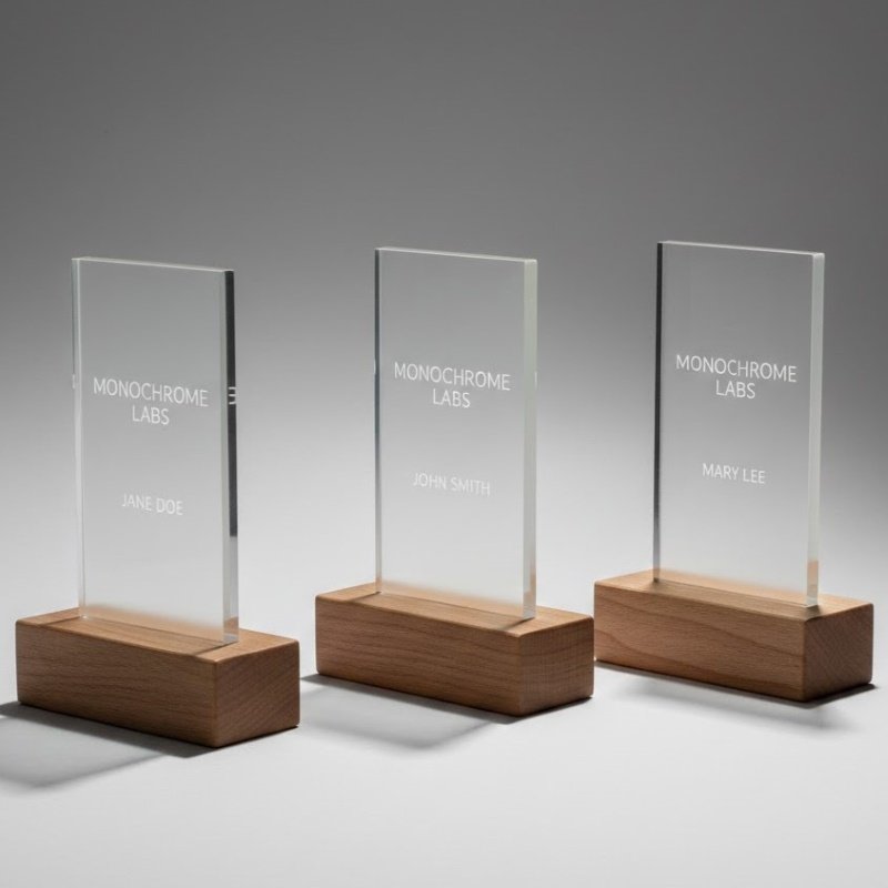 The foundation of each award is crafted from premium hardwoods like walnut, maple, or bamboo, all sourced from FSC-certified forests. We prioritize wood species that are managed responsibly to ensure long-term forest health. Each base is finished with natural, VOC-free oils rather than harsh chemical lacquers, preserving the wood’s tactile feel while protecting the environment.